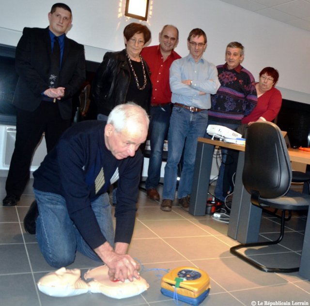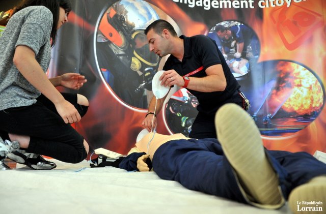 Grégory Dessi, sapeurs-pompiers à Thionville, nous fait passer un par un. Il commence tout doux. Il nous apprend à sortir une personne inanimée d’un environnement toxique. « Il faut la saisir par les poignets ou les chevilles pour la tirer sur le sol. » Jusqu’ici tout va bien. Puis Grégory nous fait le coup de la "fausse route", lorsqu’un aliment bloque les voies aériennes. Claques dans le dos, compressions abdominales : le mannequin n’est pas ménagé.